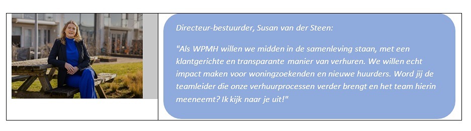Je bent een inspirerend leider die richting geeft, rust brengt en medewerkers laat groeien. Je combineert een coachende, menselijke aanpak met een duidelijke focus op kwaliteit en resultaat. Je hebt een moderne kijk op dienstverlening en begrijpt waar woningzoekenden en huurders en medewerkers behoefte aan hebben.